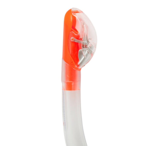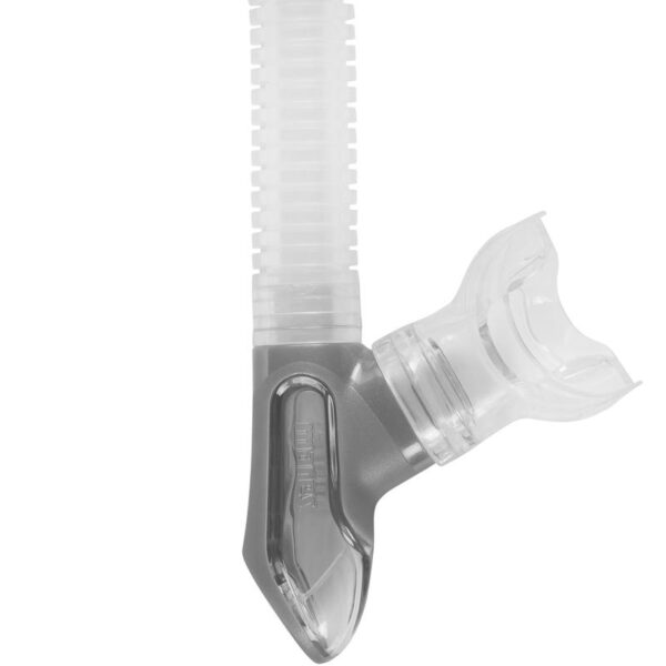 The Mares Ergo Dry snorkel is designed with a patented "dry top" and an ergonomically correct curved mouthpiece, making it one of the most comfortable snorkels on the market. The combination of the Mares Ergo Dry 100% dry top and exhaust valve in the mouthpiece ensures completely dry breathing, while the one-way purge valve makes breathing easier.