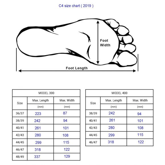 The advanced concepts behind the 300 2.0 easy fit foot pockets project are all found in the 400 foot pockets, which are made with a traditional Synthetic Thermo Rubber. The 400 foot pockets with their low weight, however, demonstrate jointly how the design skills of C4 do not depend exclusively on refined materials. They are pre-formed by 3 °, have reduced volume and great hydrodynamics, are extremely comfortable thanks to the particular C4 Best anatomy and the controlled deformability of the upper that wraps the foot.