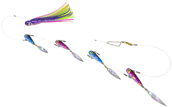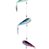 The Rob Allen Bait Ball Flasher is a compact string of metal flashers, shaped like bait fish, trailing a swivelling tail.