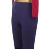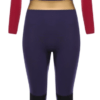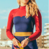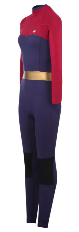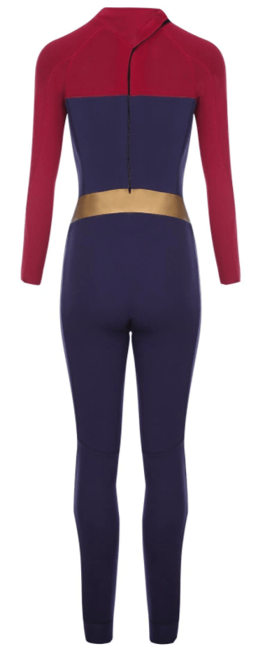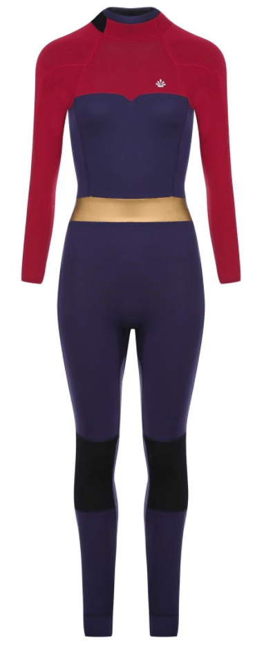 A feminine wetsuit designed with a high-waisted mesh neoprene waistband and a blue top with burgundy shoulders and arms.