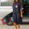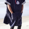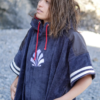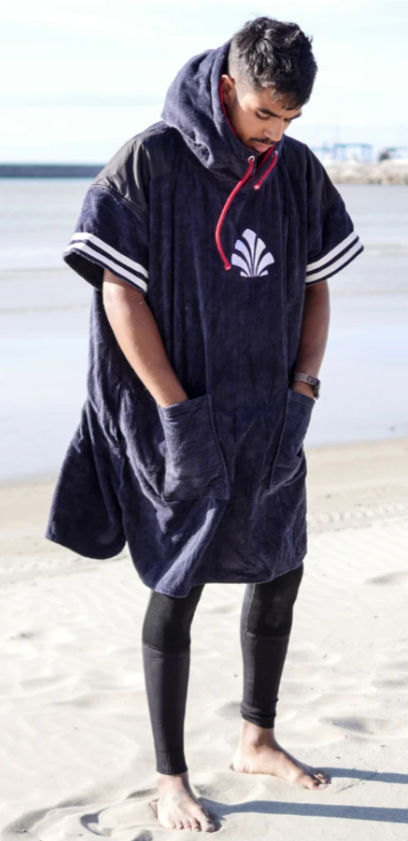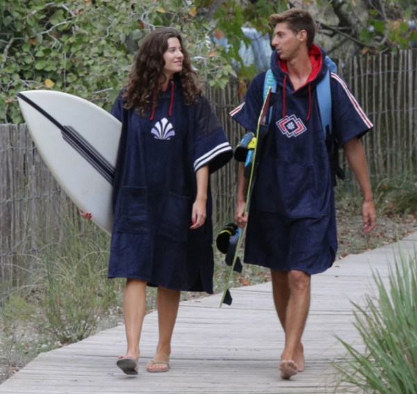 A large poncho hooded two-tone sponge that pulls like a sweater and under which you can change or stay wandering on the spot.