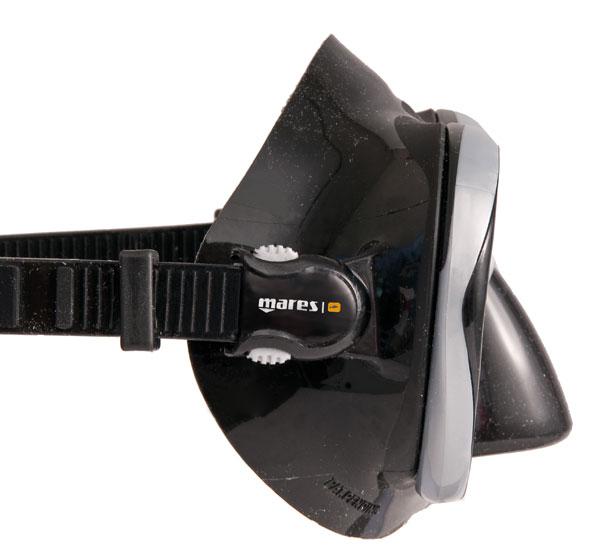 Featuring the patented shock-absorbing system, a Mares exclusive, with special absorbers placed between the skirt and the frame to distribute and reduce the pressure of the frame against the face.