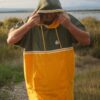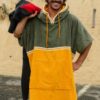 Большое двухцветное мочалка-пончо с капюшоном, которое натягивается как свитер, и под которым можно переодеться или остаться на месте.