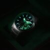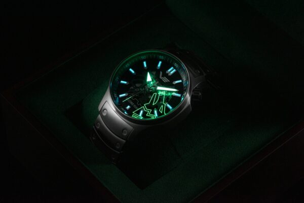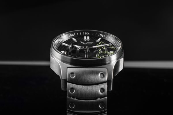 Ciferblatas: juodas su reljefiniu raštu, pakeltais indeksais, sidabrinės spalvos logotipu ir pilies forma 6h Apšvietimas: „Super Luminova“ ant rodyklių (žalia spalva)
